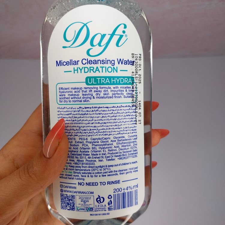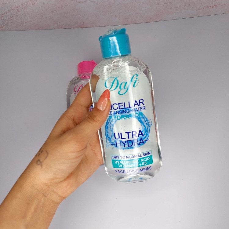 میسلار صورت دافی مدل Hydration بدون ایجاد خشکی روی پوست، آرایش را پاک مینماید. این محصول قدرت پاککنندگی فوقالعادهای دارد و ضد حساسیت می باشد. به همین علت به جز صورت، برای چشم و لب خود نیز میتوانید از آن استفاده نمود. محلول میسلار واتر دافی علاوه بر قدرت پاک کنندگی خوب، به پوست آبرسانی نیز انجام میدهد. هیالورونیک اسید، ویتامین E و B5 از ترکیبات موثر موجود در این محلول می باشند. افرادی که پوست معمولی و خشک دارند قادر هستند از این محصول استفاده نمایند. این محلول از برند محبوب دافی با ۲۰۰ میلی لیتر حجم شما را تا مدتهای طولانی از خرید دوباره یک آرایش پاککن بینیاز می کند و از این جهت کاملا مقرون به صرفه می باشد.